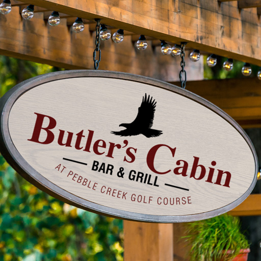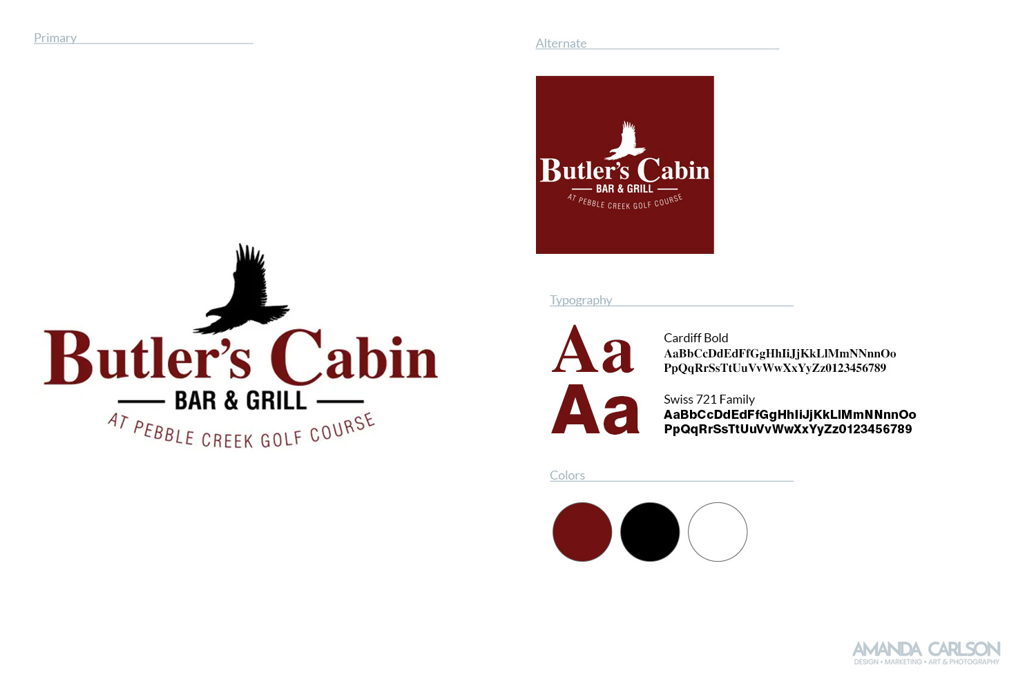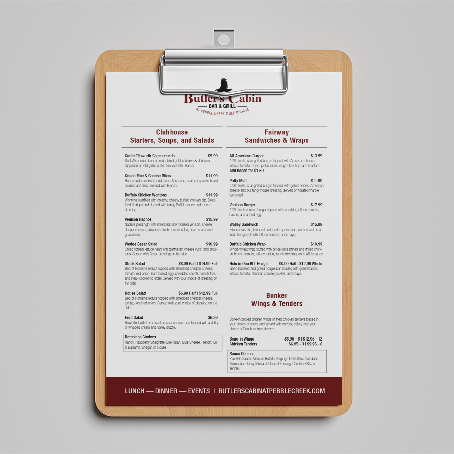 Peake Hospitality was in need of a logo for their new restaurant endeavor. They wanted a logo that was simple with elements that evoked feelings of outdoors and the north woods while fitting with the area the golf course is located in. The color scheme was a deep red and black, taking inspiration from buffalo plaid. Further design elements would lean into these rich colors paired with wood tones and textures. The eagle icon was produced from a photo of a bald eagle soaring over one of the fairways.
