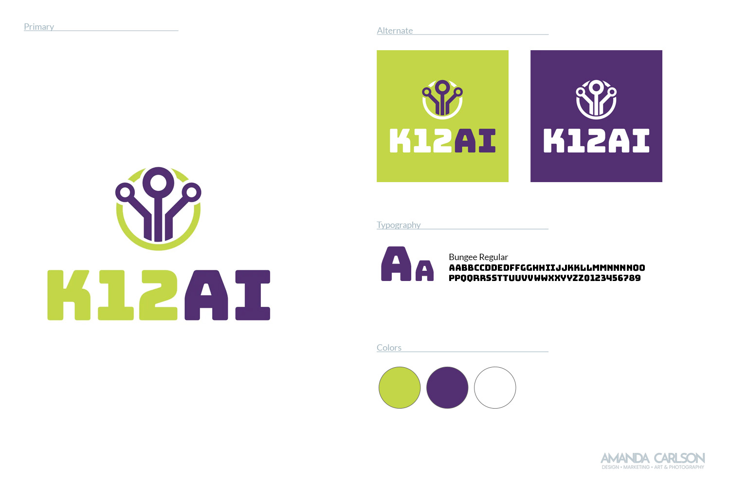 As part of the Wheelhouse team, I was the point person on the branding design for K-12 AI (stylized as K12AI). The company ran teacher training seminars about the effective implementation, use, and ethics of AI in education. The concept was to incorporate a tech element, but also make it relate to education in some way. For this, I used iconography that was reminiscent of data connections, but arranged them to look like a person with their hands up cheering.