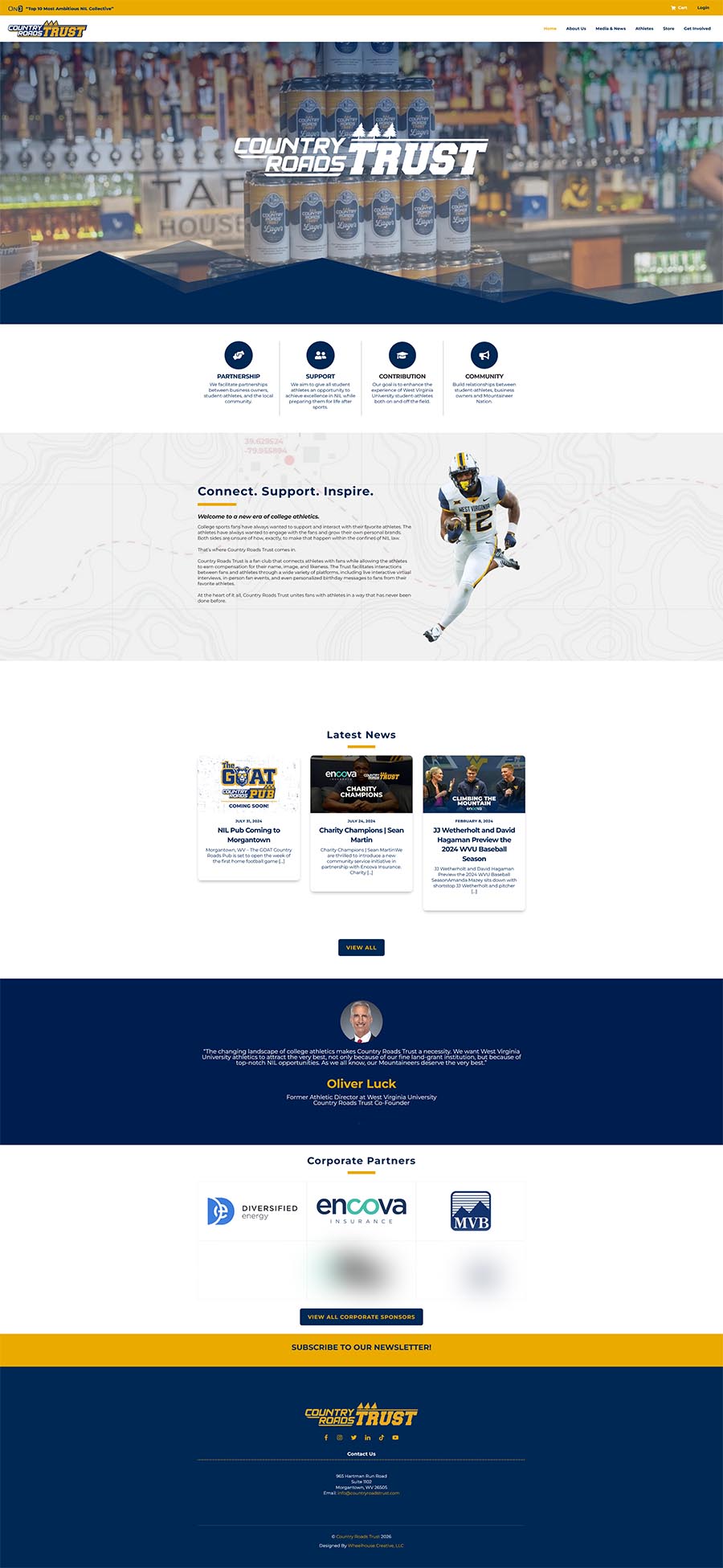 Country Roads Trust was the NIL extension of West Virginia University. When the NIL formed, they contracted Wheelhouse Creative, LLC to handle their branding, website, and other marketing needs. About 2 years ago, they requested a rebrand, initially just for promotional swag and give aways, but they liked it so much they took it on as their full brand.